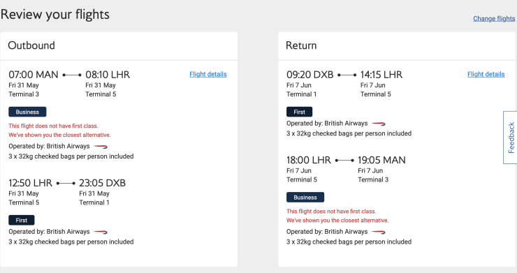 – There are multiple times of the year where they give you the opportunity to buy avios points. Wait for the Avios 50% bonus sale (generally two times a year). You can buy 150,000 avios for circa £1500. As you will see above that gets you a return to Dubai for two people, in first, with a companion voucher, with some Avios change, for taxes. So total cost of a return first class to Dubai around £2800 for two people.